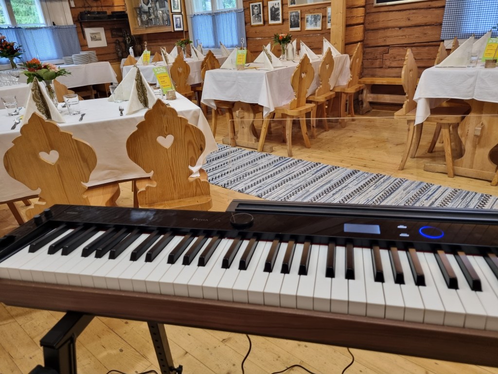 Minulta toivottiin taustamusiikkia ruokailun lomaan ja sen lisäksi muutaman kappaleen lauluesitys onnittelulauluineen. Toteutan esityksiä joko kitaran tai pianon kanssa. Rauhallinen pianomusiikki sopii hyvin taustamusiikiksi tällaiseen tilaisuuteen, missä ihmiset haluavat myös keskustella ruokailun yhteydessä. Instrumentaalimusiikki tuo mukavaa tunnelmaa, mutta ei häiritse vieraiden kuulumisten vaihtoa. Digitaalipiano kulkee helposti mukana keikkapaikalle ja välttämättä sen isompia äänentoistolaitteita ei tarvita. Tämä on todella hyvä vaihtoehto, jos esiintymistila on pienehkö. Mahduin hyvin pianoineni esittämään ihmisille instrumentaaliversioita kappaleista eri vuosikymmeniltä.