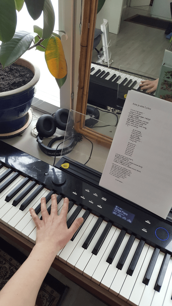 Alan harjoittelun melodian ja lyriikoiden opettelulla. Jokaisella on siihen varmasti oma tekniikkansa ja siitä voisi kirjoittaa oman artikkelinsa. Usein ”lappu” on kuitenkin täynnä muistimerkintöjä itselleni, jotka auttavat hahmottamaan melodiaa ja mitä lyriikoissa haluaa nostaa esiin. Tämän jälkeen alan miettiä sovitusta kappaleeseen ja tilaisuuteen sopivaksi. Joskus säestys tuntuu asettuvan paremmin pehmeämmäksi ja herkemmäksi; toisinaan tarvitaan enemmän meininkiä. Sitten tietysti täytyy treenata laulu ja soitto yhteen. Joskus kappale asettuu omaan suuhun sopivaksi nopeastikin ja toisinaan sitä saa vähän mietiskellä. Tähän saattaa ajallisesti mennä tunti, mutta usein useampi. Ennestään vierasta kappaletta treenaan mielellään hyvissä ajoin etukäteen, etenkin mikäli se on erityinen ohjelmanumero tilaisuudessa.